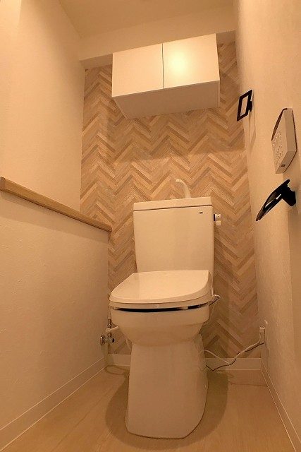 トイレはウォシュレット付き。ペーパーのストックや掃除用具を入れておくのに便利な収納棚もついています。