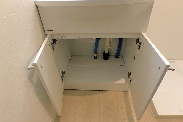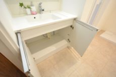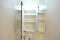 収納は洗面台下と三面鏡裏のキャビネット。細々した物が多くなりがちな洗面廻りには、収納が多いのは助かります。