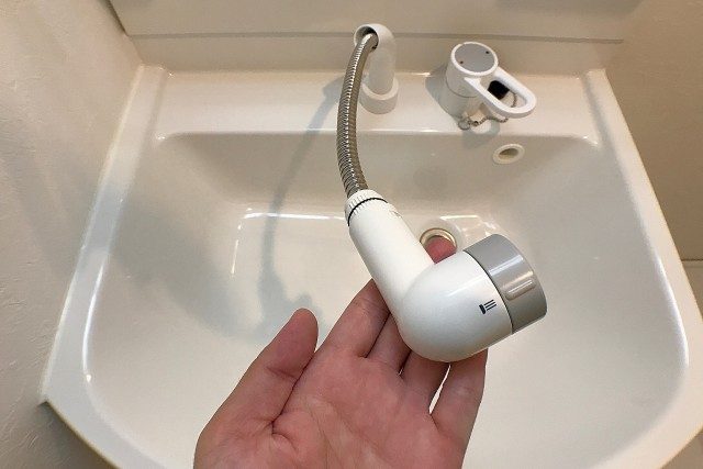 洗面の水栓はハンドシャワータイプ。洗面ボウルが広めなので、寝ぐせくらいは直せそうですね(笑)