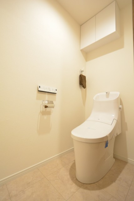 もちろん洗浄便座付き。INAX製のシャワートイレです。今では当たり前になった洗浄便座ですが歴史は意外と古く、前回の東京オリンピックが開催された1964年にTOTOさんがアメリカからの輸入販売を始めたのが最初だそうです。国産初は1967年のINAXさんとのこと。50年以上の歴史があるんですね!トイレットペーパーなどのストックに便利な吊戸棚も付いていますよ。