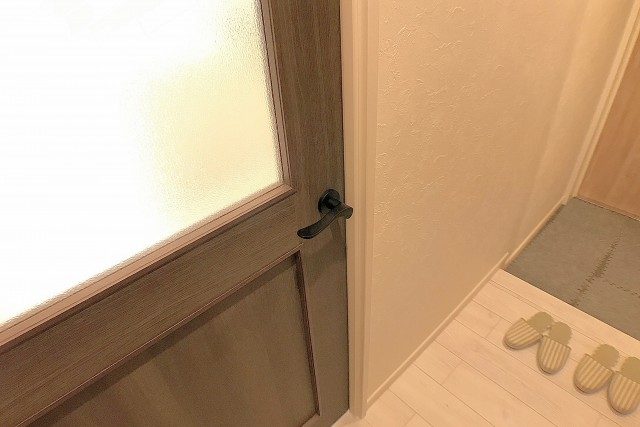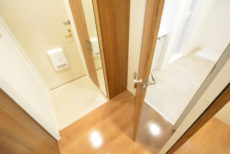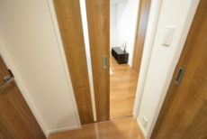 玄関をあがるとコンパクトな廊下があり、トイレ、LDK、洗面室の扉が並んでいます。