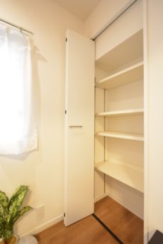 LDK内には扉付きの収納、オープンシェルフと2つの収納がつくられています。日用品のストックなど生活感のでがちな物は扉付きの収納へ入れておくとよさそうです。