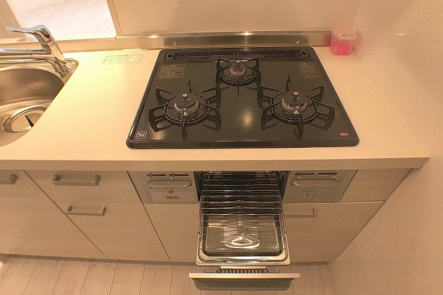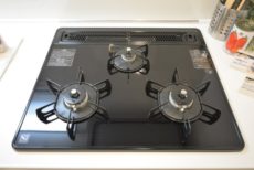コンロは3口。温度設定やタイマーが使える高機能タイプです。最近よく見かけますが、ガスコンロでもこんなことが出来るようになったんですね(^^!