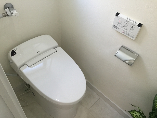 右手には、トイレ。嬉しいウォシュレット付きです。棚等は設置されていませんので、後から棚を設置したり、突っ張り棒で収納を作ったりと工夫したいですね♪♪