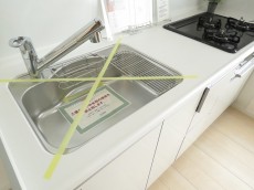 キッチンは壁面と同じく白。横が窓なのでお料理中の熱や匂いもサッと解消できるハズ。水栓は浄水機能付き、コンロは3口とスペックも◎。冷蔵庫は向かって左側に置けるようになっています。