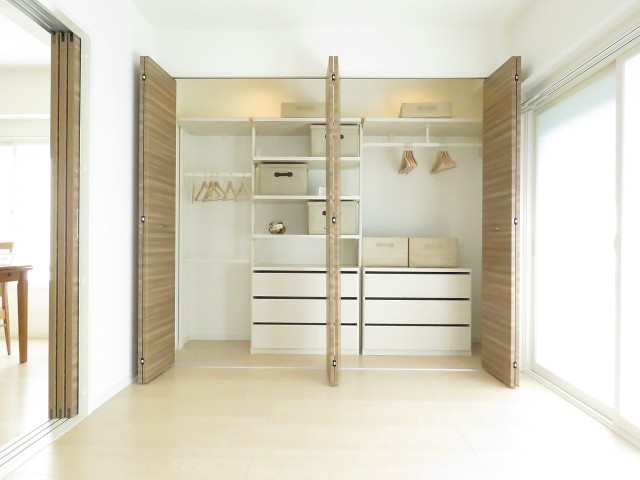 洋室にはシステム収納がついています。これならタンスや大きな収納家具は用意しなくて済みますね♪1か所に荷物をまとまれば物を探す手間も省けそうです。