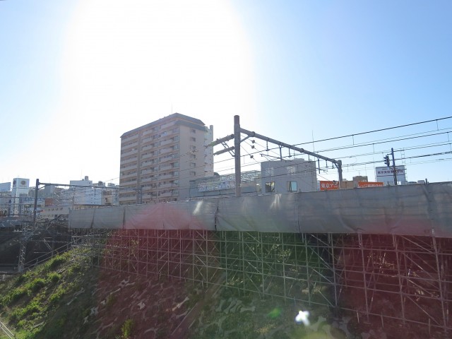 真正面は線路。ほどよく距離があるのでこちら側も開放感がありますが、電車が通れば走行音はそれなりに・・・という感じです。音の感じ方には個人差がございますので、ゼヒ一度現地でご確認いただければと思います。