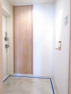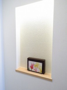 玄関ホールには棚付の物入れとちょっとした小物が飾れるニッチがつくられています。玄関扉をあけた正面がちょうどニッチのある壁面なので、宅急便など玄関先での来訪者があっても生活空間を見られる心配はありません。