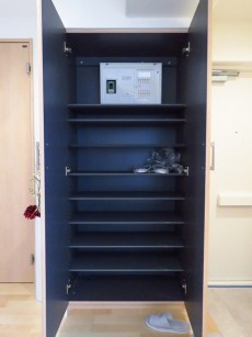 廊下を進んですぐ右側はたっぷり収納できるトールサイズのシューズBOXが設置されています。 表扉の半分には縦長の鏡がついており、お出かけ前の身だしなみチェックもサッとおこなえて便利です。