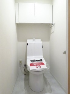 シューズBOXのお隣はトイレ。ウォシュレットとペーパーのストックや掃除道具の保管などに便利な収納棚が設置されています。