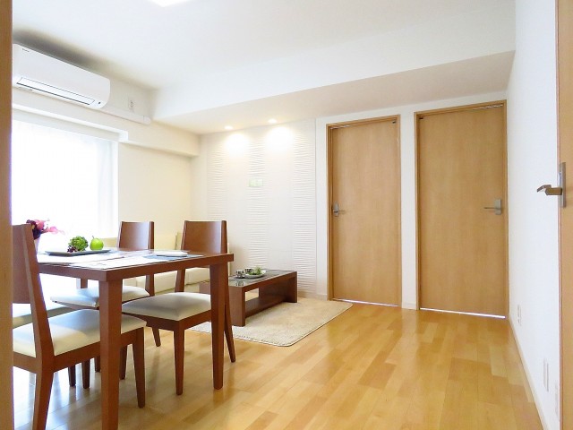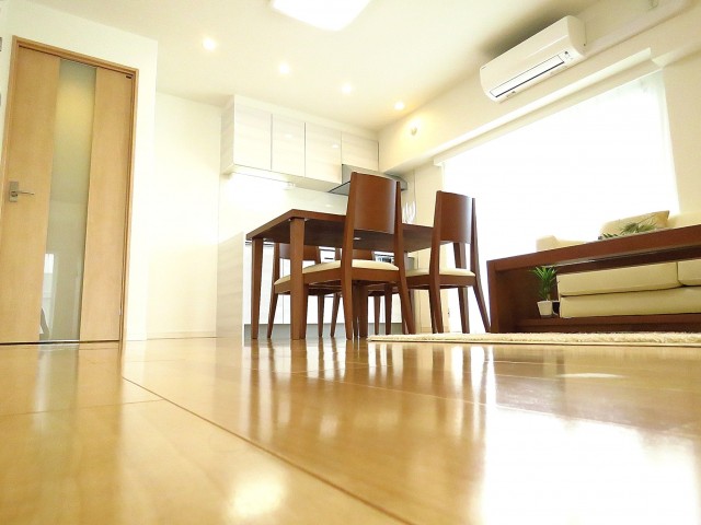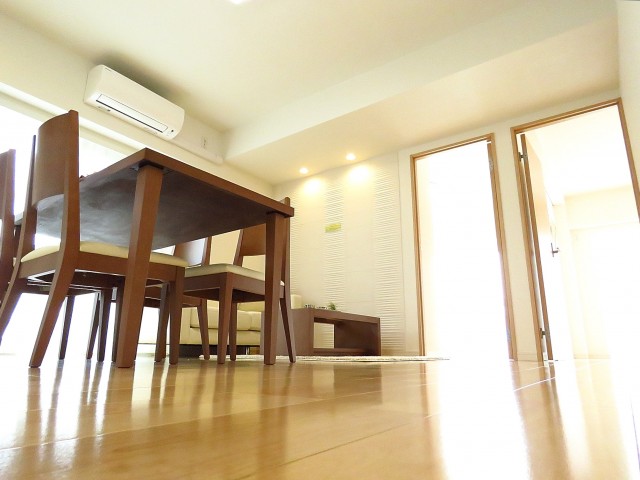 約10.4帖のLDK。家具が置いてあるので実際の生活イメージもつきやすいのではないでしょうか?エアコンがついているので引っ越したその日から快適にお過ごしいただけます。