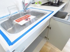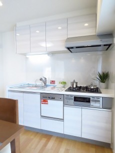 キッチンは白でうっすらと木目柄が入っています。浄水機能付き水栓、お料理がはかどる3口コンロ、食洗機、上下に収納たっぷりとスペック◎!真横に窓があるのでお料理中の熱や匂いもサッと解消できそうです。