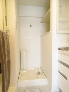 洗濯機置場の横には洗剤やタオルなどの置場に便利な棚がつくられています。