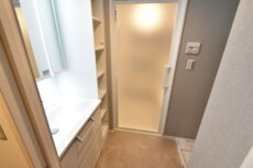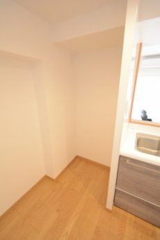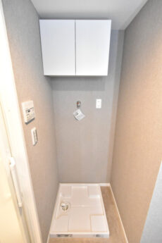 洗面化粧台の向かいには洗濯機置場があります。洗濯機置場上部には吊戸棚も!これがあるだけで洗濯用洗剤やハンガーもスッキリと収納できる、なんとも優れものなのです。