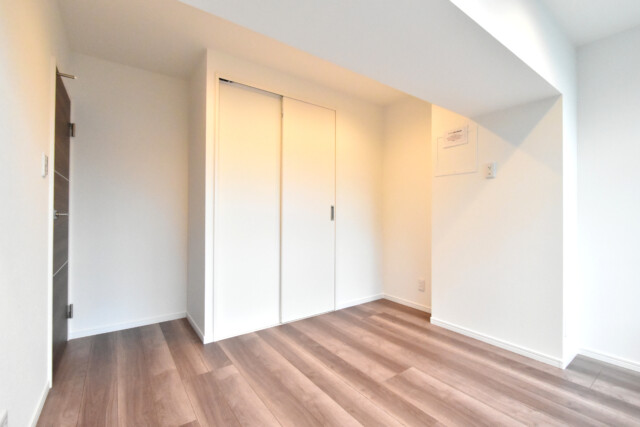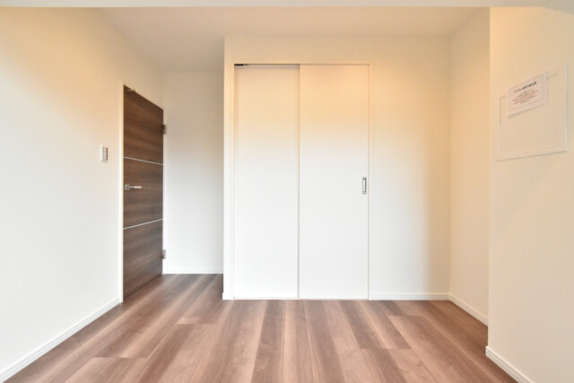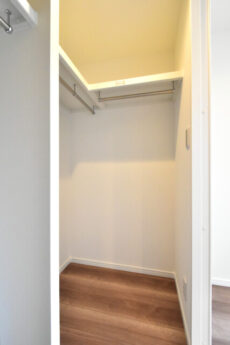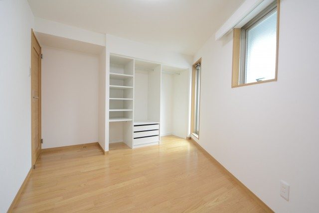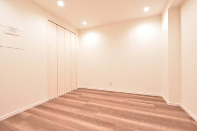 あらかじめダウンライトが設置されているので、外の光はないものの、明るさ的には申し分ありません。寝室としてお使いいただければ太陽光に睡眠を邪魔されることもなく、グッスリと眠れそうです。収納もたっぷりありますよ!!