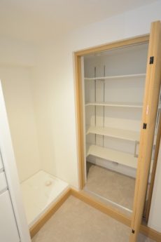 ランドリーボックスなども初めから備わっているのは嬉しいですね。隣が洗濯機スペースですのでここから直に洗濯機に入れられますよ。