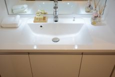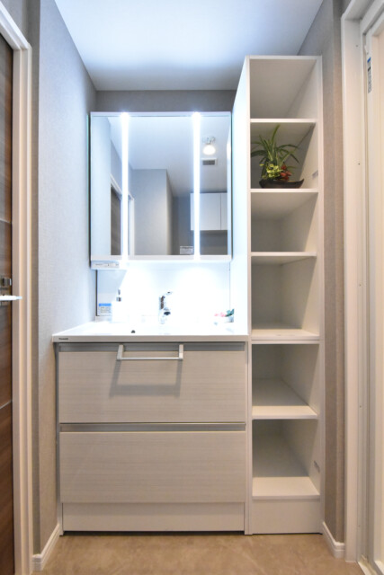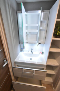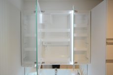 洗面化粧台は三面鏡付き、鏡部分に照明が仕組まれていることで手元が暗くなりがちな洗面室でも、お化粧時の照度が確保可能です。