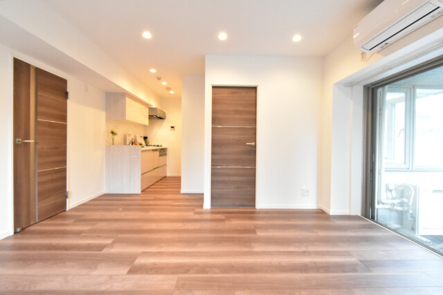 ウォールナット調のフローリングと建具がクロスの白さを引き立てるインテリアです。