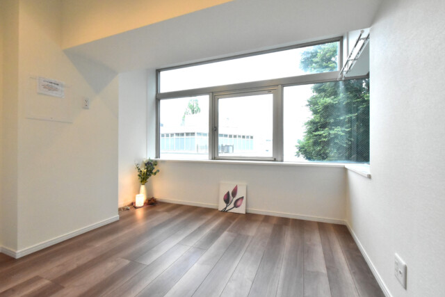 お部屋の幅いっぱいの窓からは明るい光が差し込んでいますね。お部屋自体はナチュラル系かと思いますが、家具の影響かシャープな雰囲気になっています。ちなみに家具は全て付いてくるそうですよ。