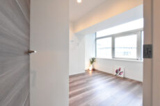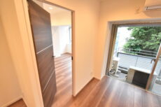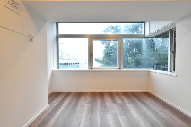 台形のお部屋になりますが、バルコニーに面した大きな窓で明るいお部屋となっています。奥にはオープンクローゼットがありました。