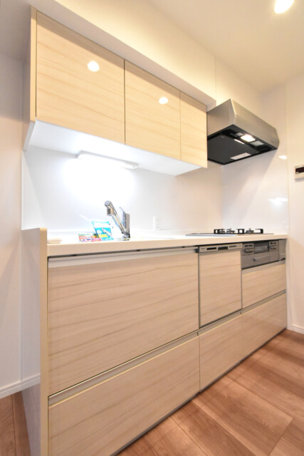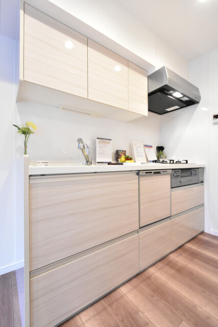 こちらがキッチンです。明るめの木目で統一されています。