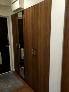 玄関入って左手、シューズボックスです☆大容量のトールサイズ×2です!!棚が可動式になっていますので、ブーツの収納もOK♪♪家族全員分の靴もスッキリおさまると思います。扉には大きな姿見があるのでお出かけ前のチェックもバッチリです(o´∀`ノ