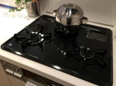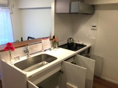 シンクとコンロの下が収納になっています。少し収納が少ないですが、壁側にゆとりがありますので大丈夫です (●´∀`)