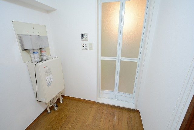給湯器と洗濯機の間にカーテンを降ろすことができるので、お風呂に入っている時に家族が洗面所を使うこともできます。
