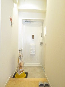 白と木目を基調とした明るい室内。玄関には人感センサーがついており、人の気配にあわせて自動で照明が消灯します。消し忘れがなく経済的です。