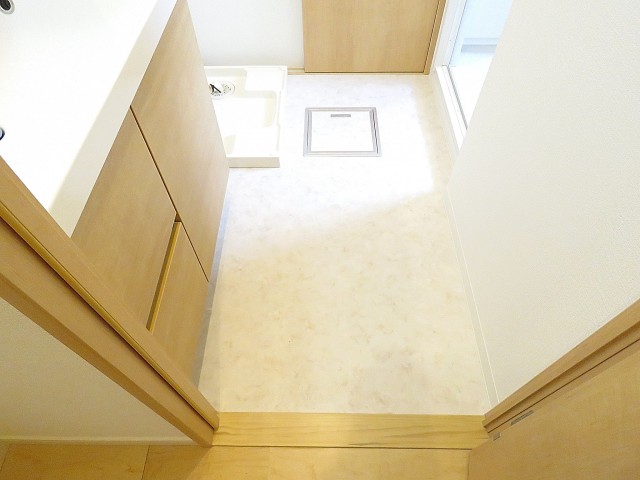 洗面化粧台と洗濯機置場はお隣同士。洗面化粧台は鏡の裏、引き出しと収納スペース豊富。小物類もスッキリ片付けおけるようになっています。