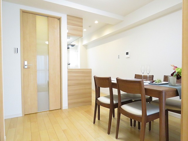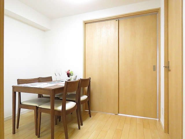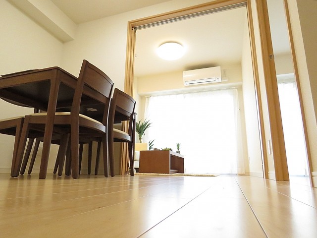 可動式扉を開放してダイニングキッチンと洋室をつなげると奥行のある空間になりました。洋室はリビングスペースとして使ってもよさそうです。
