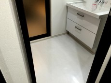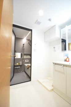 洗濯機置場の奥は、水回りを集めたサニタリールームです。右手に洗面台、正面にバスルーム、左手にトイレの配置になっています。少し段差がありますので、お気を付けください。