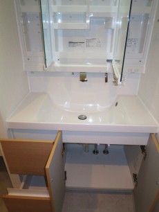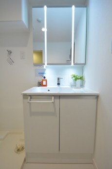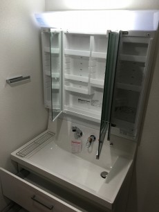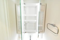 洗面台の水栓には節水効果のあるエコハンドル採用。三面鏡の裏側は