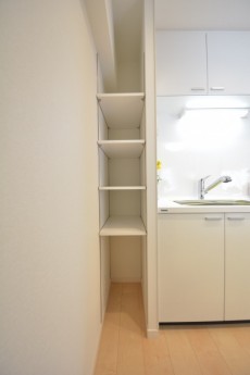 キッチンカウンターの下は収納に。キッチン横にも奥行きのある収納棚がありました。