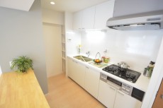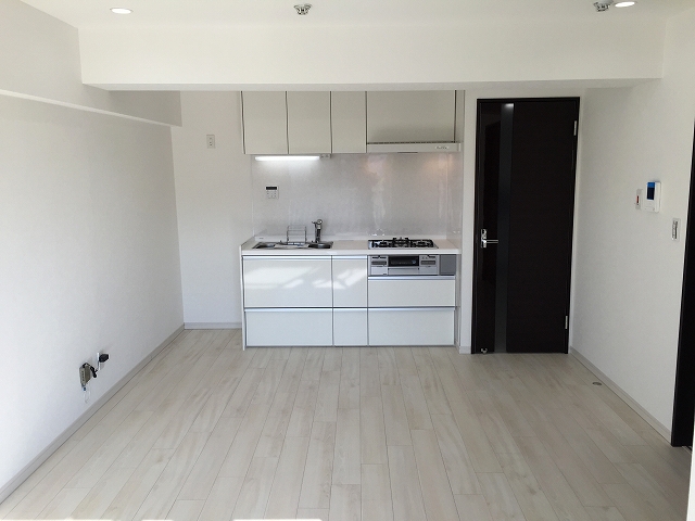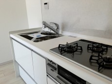 キッチンを見ていきましょう♪♪お部屋の色調に合わせた真っ白なシステムキッチン♫