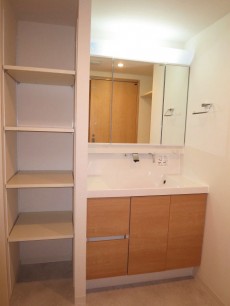 洗面室も収納た~っぷり。洗面化粧台の横手に奥行きがあるリネン庫が設けられて