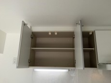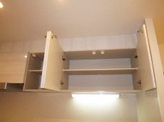 上部には耐震ラッチ付の吊戸棚が設置されているので、お気に入りの食器などを