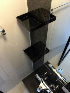 室内は温かみのある白基調ですが、バスルームは一転、シックな色合いです。