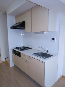 こちらがキッチンです。リビングダイニングから独立しているので、お料理に集中したい方にはおススメのキッチンです。コンロは3口・魚焼きグリル付き、しかもセンサー付きで温度管理もできてしまう優れものです。