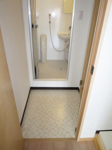 廊下から玄関扉側を見るとこのような雰囲気です。玄関扉は以前に新しく取り換えられているようで、昭和40年代の香りはしません(笑)