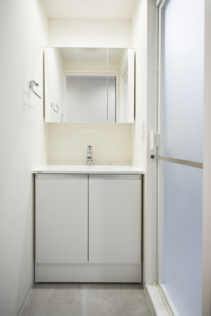 続いて洗面室です。シンプルミニマムな洗面化粧台。二面鏡裏は全て収納としてお使いいただけるようになっています。こちらには化粧品やデンタルケアグッズを入れておくと、洗面周りもスッキリと片付けられそうな予感。もちろんキャビネット下も収納です!