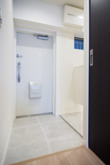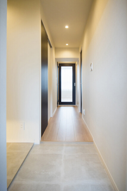 玄関扉を開けるとスッキリとした空間が広がっています。玄関のタタキはグレー、フローリングはナチュラル系でとても相性の良い配色です。