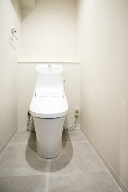 廊下に戻って、次はトイレのご紹介です。温水洗浄暖房便座付きのシンプルなトイレです。バックカウンターにはトイレットペーパーのストックを置いておけますよ!