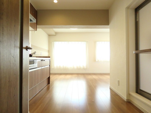 LDKは約11.4帖。扉をあけて手前がキッチンスペース、奥がリビングダイニングスペースになっています。