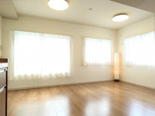 2面に窓のあるリビングダイニングは家具の配置がしやすい横長空間。