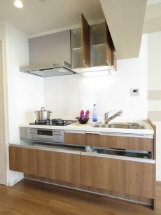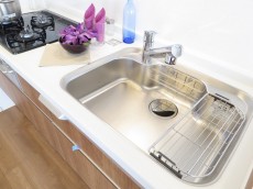 浄水器一体型シャワー水栓、3口コンロ、人造大理石カウンター、物の出し入れがしやすいスライド収納と設備も充実しています。