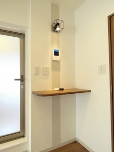 洗面室の扉の横にはTEL台。お気に入りのインテリアなども飾っておけそうです。