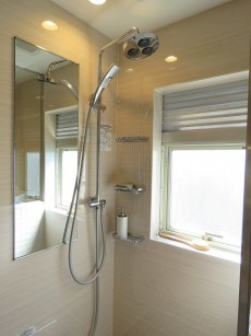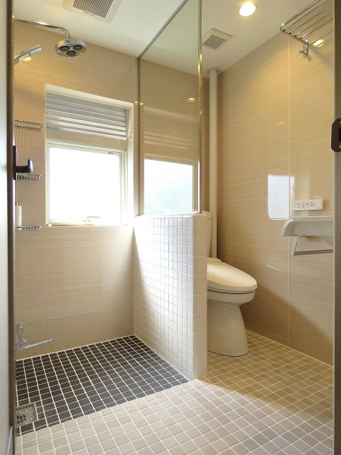 ■サニタリー・・・天井・壁パネル、床タイル、TOTO製オーバーヘッドシャワー水栓、LIXIL製シャワートイレ、SANWA製洗面ボウル