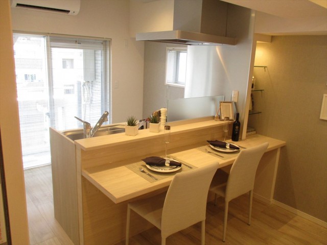 キッチン前にカウンターキッチンのサイズにピッタリの造作カウンターダイニングテーブルがあります!