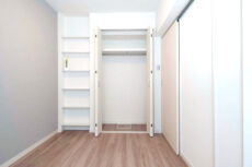 南西向きの窓があるお部屋です。柱などの出っ張りがないきれいな形で無駄なくスペースを使えそうですね。入口に引き戸が使われているので開け閉めのスペースを考える必要もありません。収納はオープンシェルフとクローゼット。